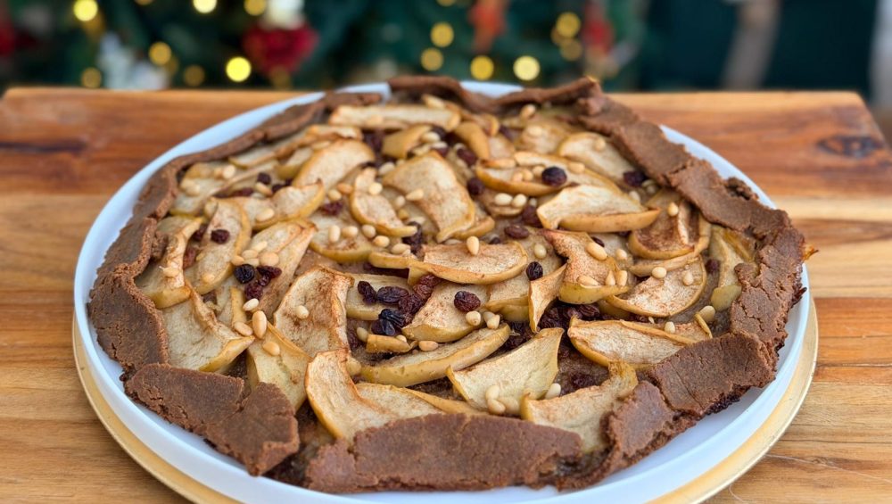 Questa galette alle mele ha una base rustica di pangrattato Primus e grano saraceno. Sopra, uno strato di marmellata agli agrumi e zenzero, mele, cannella, uvetta al rum e pinoli, un mix che richiama lo strudel e i dolci natalizi. Tutti i sapori di una torta di mele, ma con un contenuto di zuccheri più basso rispetto ai dolci tradizionali. Un dolce buonissimo che non lascia sensi di colpa.